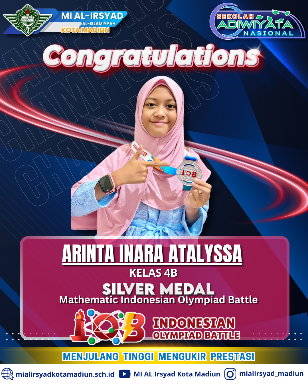 Kabar membanggakan kali ini datang dari ananda Arinta Inara Atalyssa, siswi berprestasi dari Kelas 4B. Berkat kecerdasan, ketelitian, dan ketekunannya dalam belajar, ananda Arinta sukses mempersembahkan Silver Medal (Medali Perak) untuk sekolah.
