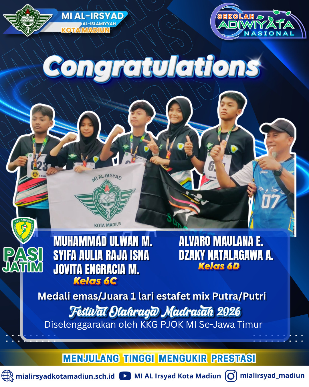 Keluarga besar MI Al-Irsyad Al-Islamiyyah Kota Madiun mengucapkan selamat dan sukses atas medali emas yang diraih oleh tim lari estafet mix.